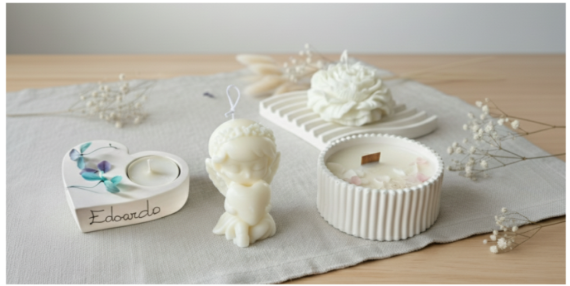 Con il tempo, tra lavoro e quotidianità, ho iniziato a realizzare candele artigianali in cera di soia, piccoli complementi d’arredo in polvere di ceramica e creazioni personalizzate pensate per celebrare i momenti speciali della mia famiglia. Oggetti semplici, realizzati a mano, capaci di custodire emozioni e raccontare storie autentiche.